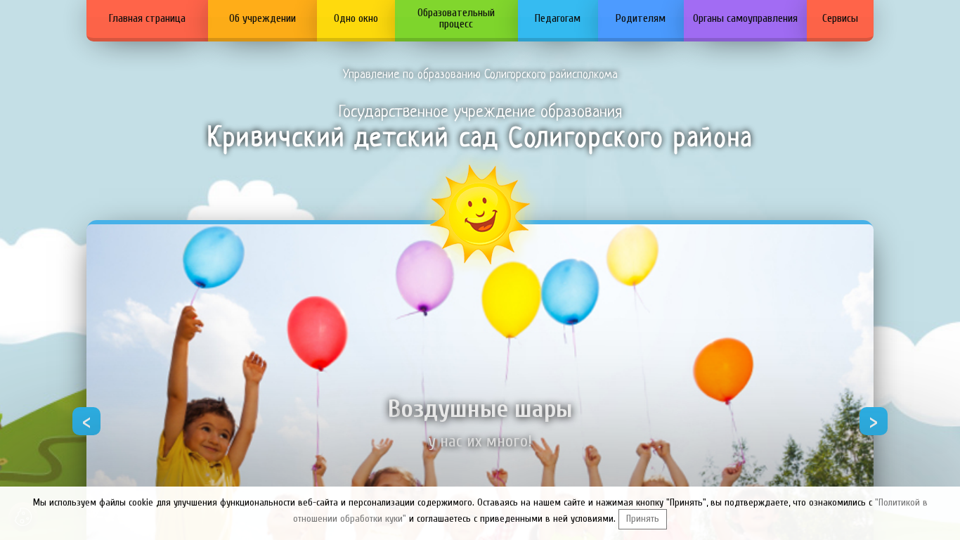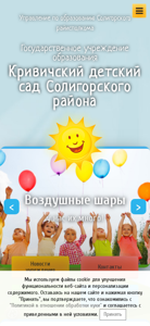 | AI-анализ | The web project "Kryvichski detschy sad Saligorskaga raiona" is an educational institution website dedicated to a kindergarten located in Saligorsk region of Belarus. The homepage offers information about the kindergarten, its administration, and the collective. Links to the Ministry of Education of the Republic of Belarus and its normative legal frameworks are provided. A photo gallery and news section are accessible. The kindergarten's admission process, working hours, and administrative procedures are detailed. Visitors can find contact information and learn about the organization's policies on data protection and union activities. The website also includes information about the 2025 Year of Improvement, an interactive map, and a portal for evaluating the kindergarten's performance. The educational process, tasks, and functions of the kindergarten are explained. Parents have access to |
