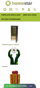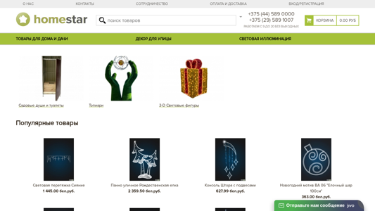 This online resource is dedicated to home decorations and plastic furniture in Minsk under the brand name HomeStar. The website offers various items for both home and garden, including decorative objects, bath and toilet facilities, and lighting solutions. The keywords suggest popular products such as Christmas trees and decorations, consoles, and garden gnomes. The website also features a shopping cart and contact information, as well as a list of popular products including a lighted Christmas tree for 1,445 Belarusian rubles and a star console for 627.99 Belarusian rubles. The website's domain is homestar.by.
