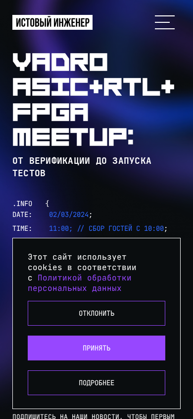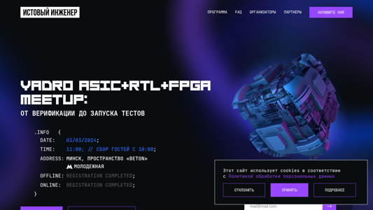 AI-анализ | --- This website is dedicated to the YADRO ASIC+RTL+FPGA Meetup event, which will take place on March 2, 2024, both in Minsk and online. The event is aimed at engineers working on FPGA-, ASIC- and RTL-design projects, who will have the opportunity to learn from leading engineers and team leaders at YADRO. Topics to be covered include system development and functional verification on silicon, iterative design implementation on FPGA, and approaches to testing and system booking. The program will include six presentations and a discussion on the role of functional verification in the context of total restrictions, led by FPGA-Systems community leader, Mikhail Korobkov. The event is open to those interested in the design of systems on chips, with a focus on practical tools and methodologies used in the field. Registration for both |