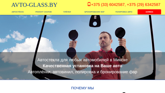 AI-анализ | --- The portal avto-glass.by is a website dedicated to auto glass replacement services in Belarus, specifically in Minsk. The site offers installation of various auto glasses for any type of vehicle, including windshields, side windows, and rear windows. The services provided include not only replacement but also repair of damages such as scratches and cracks. The website mentions that they work with multiple auto glass manufacturers to ensure availability and affordability of the best options for their clients. Clients can submit a request for a quote or repair on the site and receive a 20% discount. The site also offers services like auto glass polishing and protection for fars. The website states that they have over 10 years of experience in auto glass installation and repair. They also mention that they provide a permanent warranty on their installations. The site lists their contacts as +375 (33) |