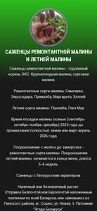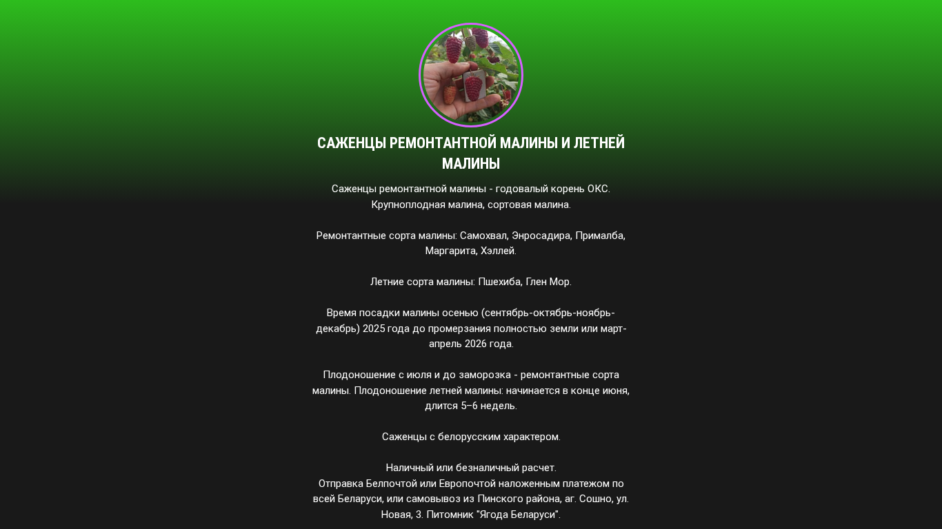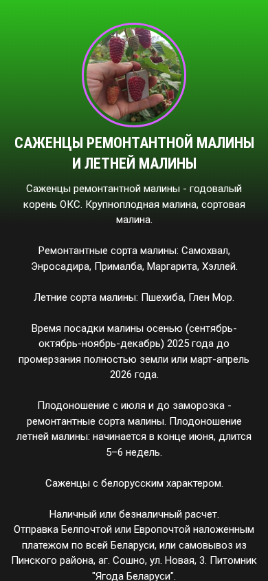 | SEO-описание | Саженцы ремонтантной малины - годовалый корень ОКС. Крупноплодная малина, сортовая малина. Ремонтантные сорта малины: Самохвал, Энросадира, Прималба, Маргарита, Хэллей. Летние сорта малины: Пшехиба, Глен Мор. Время посадки малины осенью (сентябрь-октябрь-ноябрь-декабрь) 2025 года до промерзания полностью земли или март-апрель 2026 года. Плодоношение с июля и до заморозка - ремонтантные сорта малины. Плодоношение летней малины: начинается в конце июня, длится 5–6 недель. Саженцы с белорусским характером. Наличный или безналичный расчет. Отправка Белпочтой или Европочтой наложенным платежом по всей Беларуси, или самовывоз из Пинского района, аг. Сошно, ул. Новая, 3. Питомник "Ягода Беларуси". Отправляем от 3 штук Белпочтой или Европочтой наложенным платежом. Акция на стоимость саженцев (принимаем заказы на осень 2025 года)(годовалый корень ОКС. При посадке осенью даст урожай в 2026 году): От 3 штук - 5 рублей за саженец. От 10 штук - 4 рубля за саженец. От 50 штук - 3 рубля за саженец. От |