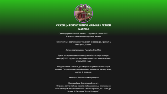 | AI-анализ | This online resource is a berry nursery called 'Ягода Беларуси' (Yagoda Belarusi) selling seedlings of reparable and summer raspberries. The nursery offers various sorts of reparable raspberries, such as Self-Rooting, Enrosadira, Priminalba, Maragrita, and Halley, and summer raspberries like Pshekiba and Glen Mor. Customers can choose to plant the seedlings in autumn (September-December 2025) before the ground freezes completely or in March-April 2026. Reparable raspberries bear fruit from July until frost. Summer raspberries start bearing fruit at the end of June and last for 5-6 weeks. The seedlings have a Belarusian origin and can be purchased through a cash or bank |
