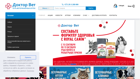 | AI-анализ | This website is a veterinary pharmacy directory called "Doctor Vet". It provides information on the availability, addresses, and phone numbers of various veterinary pharmacies. The website also features current promotions and discounts. Keywords related to the website include "vetapteki.by", "cookie policy", "Minsk", "phone number" (Ветаптеки +375-29-3-208-000), and various veterinary-related terms such as "preparats", "кормушки", and "витамины". The top_words indicate popular items for sale, including "rub" (Russian currency), "заказать" (to order), "выбрать" (to choose), "акция" (promotion), and "ветеринарные" (veterinary). The unp number is 190 |