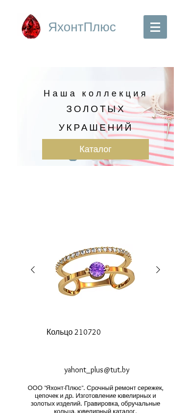 | AI-анализ | The website Yahont-Plus is a jewelry catalog and repair shop located in Brest, Belarus. The business offers a variety of services including the repair and production of jewelry and gold items, as well as engraving and the sale of obruchalnye kol'ca (engagement rings). The homepage features a selection of zolotykh ukrasheniy (golden ornaments) for sale, listed under the categories of Кольцо (Rings) and Серьги (Bracelets or earrings). The website provides contact information, yahont_plus@tut.by, for inquiries and offers a catalog of its offerings. The business is identified as ООО "Яхонт-Плюс" (JSC "Yahont-Plus"). The website is copyrighted in 2024. |