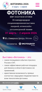 | AI-анализ | The website is dedicated to the 20th International Specialised Exhibition of Laser, Optical and Optoelectronic Technology named "Фотоника-2026". The event takes place at Media Center in Moscow from March 31 to April 2, 2026. The website provides information on the exhibition's program, themes, participants, and benefits for attendees. Visitors can find details on registration, floor plans, and additional services. The website also features a section for press releases and media accreditation. |