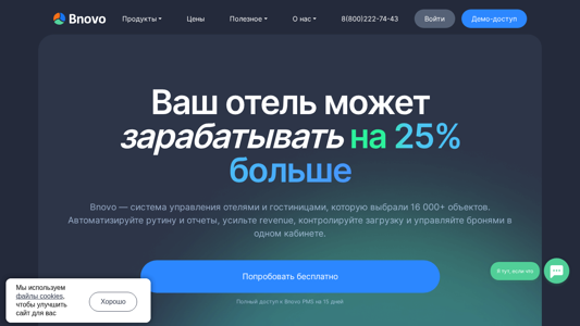 | AI-анализ | The web project Bnovo is a hotel and resort management system (PMS). Bnovo offers a Channel Manager, RMS (Revenue Management System), reservation module, and competitor price monitoring. The system includes products such as a hotel management system, channel manager, booking module, revenue tools, additional features like registration module, payment gateway, cleaning module, CRM integration, electronic locks, report block, IP-telephony, Yandex.Travel integration, and a course for advanced revenue management for hotels. Additionally, the site provides a blog, knowledge base, releases, IT-solutions registry, YouTube channel, and demo access. Bnovo serves over 16,000+ hotel and resort properties, aiming to automate routine tasks and reporting, boost revenue, manage bookings, and control occupancy levels within one interface. |