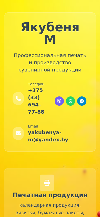 | AI-анализ | This online resource, titled "Компания 'ЯкубеняМ' - профессиональная печать и сувенирная продукция," is a professional printing and souvenir production company. The website offers a variety of printed products including calendars, business cards, paper packets, notebooks, brochures, catalogs, and folders. Additionally, the company produces souvenirs such as diaries, pens, and dishes. Exclusive solutions are also available for customized printing in lacquer or white color, and embossing with foil. The company can be reached via telephone at +375 (33) 694-77-88 or email at yakubenya-m@yandex.by. The domain name for this resource is yakubenyam.by. |