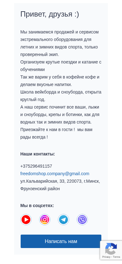 | AI-анализ | This online resource is a shop and school for extreme sports equipment, offering proven gear for both summer and winter activities. They organize exciting trips and lessons, and also serve coffee and make delicious beverages in their coffee shop. The vakeboarding and snowboarding school is open year-round. Their service can repair all types of skis, snowboards, bindings, and boots for both water and snow sports. Welcome guests anytime! We are always happy to see you! Contact information is provided, including a phone number, email address, and physical location in Minsk, Belarus. Social media links are also included. The website is owned by the Limited Liability Company "Freedom Company." |
