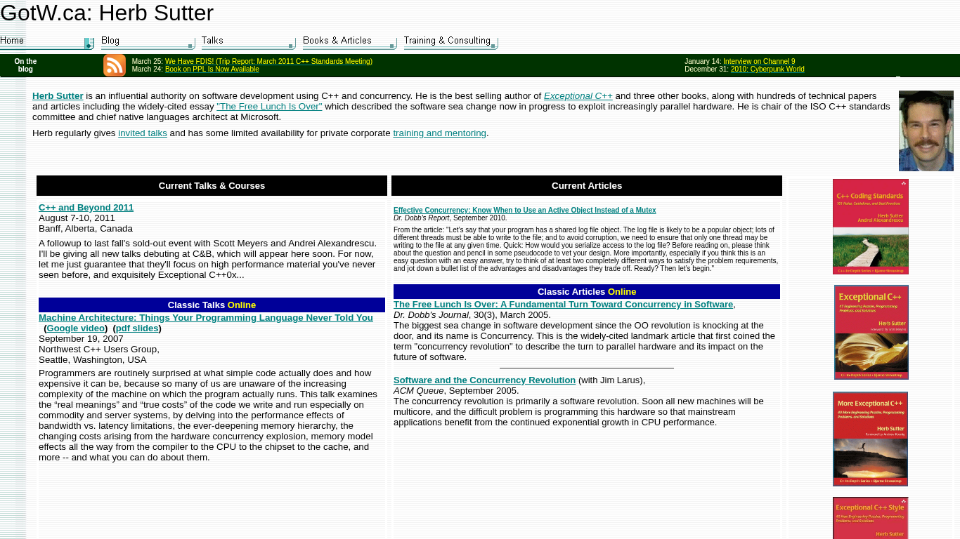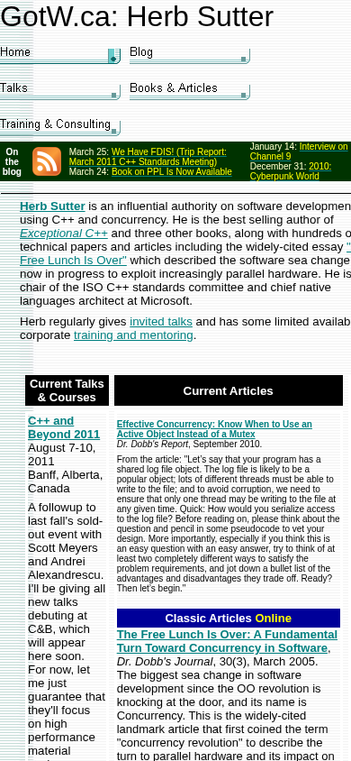 | AI-анализ | The portal gotw.ca is a blog and resource website dedicated to software development using C++ and concurrency. It is authored by Herb Sutter, an influential figure in the field, and features articles, talks, and courses on advanced topics related to high performance C++ programming. The homepage provides information on current and upcoming talks, articles, and courses, as well as links to some of Herb's most popular content, including interviews and his influential essay "The Free Lunch Is Over". The website also serves as a platform for Herb to share his expertise through private corporate training and mentoring. |