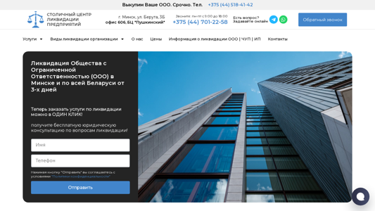 | AI-анализ | The portal is a business consultancy specializing in the liquidation of companies in Minsk and Belarus. It offers its services in various forms, including voluntary liquidation of legal entities, partnerships, or individual enterprises. The website also provides information on the different types of liquidation, such as selling or reorganizing the business or filing for bankruptcy. The business center is located in the heart of Minsk, at ul. Beruta, 3B office 606, in the "Pushkinsky" business center. Contact information includes a phone number for inquiries from Monday to Friday, 9:00 to 18:00, as well as Telegram and WhatsApp for online consultations and a callback service. The company has over 20 years of experience in liquidating businesses in Belarus and offers a free legal consultation to clients. The team consists |