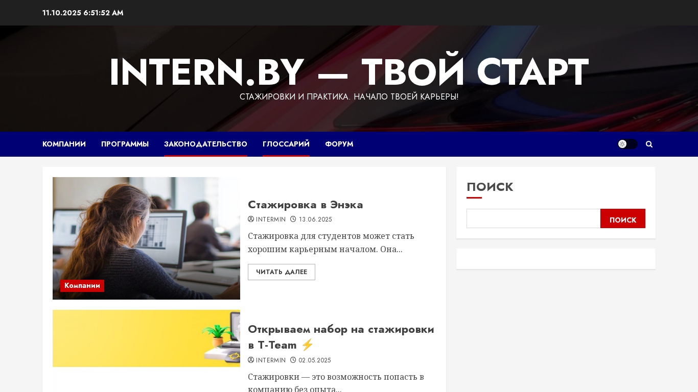 | AI-анализ | language: ru This website, Intern.by, is dedicated to internships and practical experience in Belarus. It provides information on the conditions and prospects of these opportunities, as well as the rules and laws governing them. The site includes a forum for discussion. The content is primarily geared towards students, with numerous articles on available internships and practical experiences offered by various companies, including T-Team, MTBank, and Zubr Capital. The website also covers the process of applying for and completing internships and practical experiences in the field of forestry. |