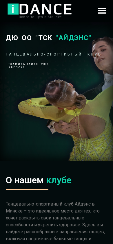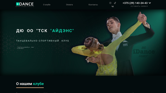 | AI-анализ | This online resource is the website for "ДЮ ОО "ТСК "Айдэнс" — Танцевальный спорт" (Junior Organization "TSK Aidens" - Dance Sport Club) located in Minsk, Belarus. The title and description indicate that it is a dance school offering various dance styles including ballroom dancing and choreography. The keywords suggest that the website is about a dance club with a focus on teaching people how to dance, specifically Latin dance and solo dance, and that it has well-equipped halls for dance activities. The website also offers classes for all age groups and skill levels. The website includes information about the club, pricing, and contact details. The top words indicate that the website is about a dance club where people can learn to dance, specifically Latin dance and solo dance, and that it has multiple dance halls and qualified teachers |