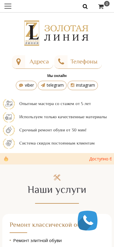 | AI-анализ | The website is a shoe repair service based in Minsk, Belarus, operating under the name "Золотая линия" (Golden Line). It offers restoration and painting of leather goods, and lists seven different workshops' addresses and working hours, as well as their telephone numbers. The website also includes sections for services offered, contact information, pricing, delivery throughout Belarus, and a portfolio. The website features over 300 pick-up points for orders. The business claims to have experienced repairers with a five-year tenure, uses only high-quality materials, and offers a quick repair service within 30 minutes. It also provides discounts for regular clients and extended warranties. Services include repair of classic and elite shoes, painting of shoes and leather goods, and various modifications such as rastyazhka (lengthening of the sole), replacement of heels, and cleaning. The |