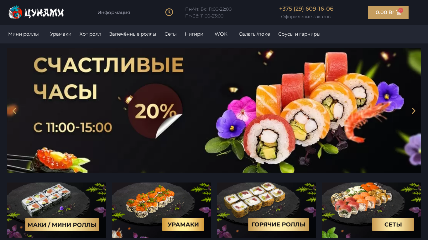 | AI-анализ | The portal Tsunami.by offers sushi delivery in Zhodino. Free delivery. Discount on self-pickup. The offer includes information on deliveries, contact details, and company background. Public offer: Monday to Thursday, 11:00-22:00; Friday to Sunday, 11:00-23:00. Contact: +375 (29) 609-16-06. Available items: mini rolls, maki, uramaki, hot rolls, sets, nigiri, gunkany, wok, soups, salads/poke, sauces and garnishes. Discounted sets: Set 10 for 67.50 Br (original price 79.50 Br), Set 6 for 45.50 Br (original price 4 |