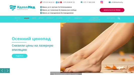 | AI-анализ | --- The website is for IdealMed Medical Centers in Minsk, Belarus, which has three branches in the city. The website offers various medical services including laser and injection cosmetology, ultrasound, gynecology, and others. The doctors have extensive experience and the equipment is from Germany and Israel. The methods used are highly effective. The contact information for the center located on K. Tsetkin Street, as well as the addresses and contact information for the branches on Solnechna Street, Kovalevskaya Sloboda, and Aerodromnaya Street, are provided, along with their operating hours. Services offered include apparatus cosmetology, microneedling RF-lifting, photo rejuvenation, scar and stretch mark removal, laser shaving, laser peels, and laser vein and vessel removal, among others. Ultrasound services for various |