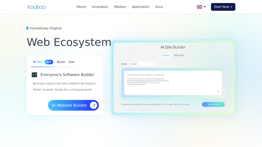 | AI-анализ | language: en The portal Kooboo Web Ecosystem is a comprehensive platform that offers a wide range of tools and services for building, managing, and growing websites and web applications. It includes an AI website builder for creating sites three times faster, a dev tools suite for full-stack development, and a collection of apps and templates for various business needs. Users can build, use, or sell their creations, either as open-source or commercial projects. The platform also provides tools for design, office management, and community building, among others, and offers a shared file cloud, group chat, and community cloud for collaboration. The portal supports multiple users and access control, and includes a webshop for customized e-commerce solutions. The language of the portal is English. |