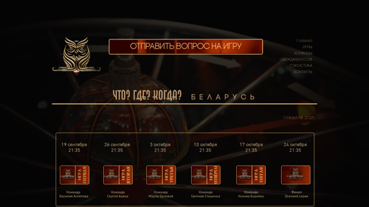 | AI-анализ | The web project "ЧТО? ГДЕ? КОГДА?" in Belarus is a website dedicated to game competitions. It provides information about various teams participating in these games, their members, and the dates of the games. The site features a list of teams, including those led by Fedor Schvedov, Ksenia Boreyko, Stanislav Mudry, Maria Potapova, Tatiana Koroleva, and Marta Orlovaya, among others. The teams are categorized by the year of their formation, such as 2024 and 2025. The site also includes a section for rules and a schedule of games, with specific dates for each team's competition. The final of the autumn series is scheduled for October 10, 2025, and the participating teams include those led by Evgenia Stishchenko, |