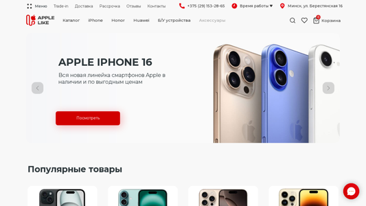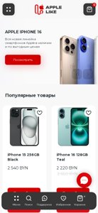 | AI-анализ | --- The web project "Apple-like.by" is an e-commerce platform based in Belarus selling Apple iPhones and electronics. Customers can buy both used and new iPhones in Minsk and Belarus with free delivery. Financing and installment plans from banks are also offered. Keywords include "купить айфон в минске" (buy iPhone in Minsk), "apple", "смартфоны" (smartphones), "iphone", "магазин" (store), "trade-in", "доставка" (delivery), and "рассрочка" (installment plans). The store offers a catalog of iPhones, Honor, and Huawei devices, as well as accessories, laptops, and trade-in options. The physical store's operating hours are Monday, Wednesday, Friday |