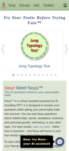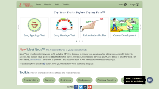 | AI-анализ | This website, titled "Home," offers a range of quizzes and tests related to various aspects of personal and professional development, including relationships, career, workplace, business, personal growth, and well-being. The site's description mentions keywords such as "quiz," "your," "nous," and "tests," among others, indicating the primary focus on self-assessment tools. The website features an AI-powered virtual assistant, Nous, which can answer questions based on the user's test results for optimal responses. The site also includes toolkits, which are interest-oriented collections of tests and related materials, for different topics. The domain is humanmetrics.com. |