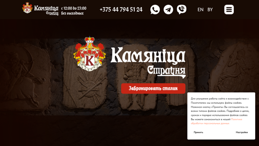 | AI-анализ | This website is for a restaurant named "Камяница" (Kamyanitsa) in Minsk, Belarus, serving authentic Belarusian cuisine. The restaurant's atmosphere evokes the elegance of a noble banquet from the 15th to 17th centuries. Generous portions and warm, inviting encounters are promised. The website includes information on reserving tables, contact details, and location on popular mapping services. "Камяніца" is the oldest restaurant of its kind in the city, having opened its doors in 2003. Traditional Belarusian dishes, a carefully designed interior, music, and staff transport visitors back in time. The establishment offers multiple halls for various group sizes, a VIP room, and a separate bar area with sports broadcasts. In addition to common beverages, the menu features numerous well-known and unexpected |