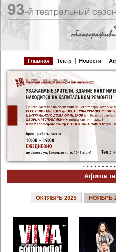 | AI-анализ | --- The web project "Rustheatre.by" is the official website of the National Academic Dramatic Theatre named after Maxim Gorky in Minsk, Belarus. The site provides information about the theatre's current productions, upcoming shows, and ticket sales for various performances held at the Central Dom of Officers and the Republic Palace of Culture. The website includes a blog by the theatre's chief director, as well as bios of notable actors such as Rostislav Yankovsky, Sergey Kovalchik, Boris Lucenko, Olga Klebanovich, Bella Masuyan, Alexander Tkachenok, Ivan Mazkevich, Andrey Dushchekhin, Sergey Chekeres, Ruslan Chernecky, Veronica Plyashkevich, Valentina Yerenkova, and Mikhail |