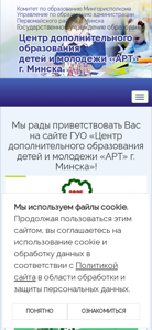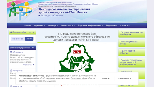 | AI-анализ | This website belongs to the State Educational Institution "Center for Supplementary Education of Children and Youth 'ART' of the City of Minsk." It is an educational organization under the Minvogorispolkom's Department of Education and the Administration of the First Mai District in Minsk, Belarus. The website provides information about the center's administration, departments, events, services, and various educational programs for children and young adults. Key topics include administrative procedures, contact information, history, achievements, international cooperation, and disability support. The website also features vacancies, a news section, and an archive of past news articles. Additionally, there are sections for parents and students, situational assistance for disabled individuals, and paid services. The site is accessible in a simplified version for visually impaired users. |