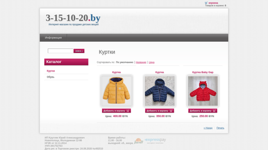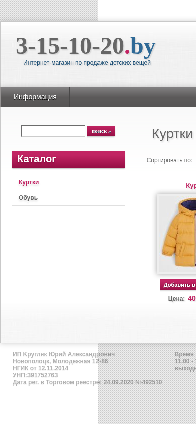 | AI-анализ | The website 3-15-10-20.by is an e-commerce platform specializing in the sale of children's clothing, specifically jackets or coats. The title of the website includes this information, and the keywords reflect the focus on children's items and the shopping cart feature. The top words indicate that users can search for items, add them to a cart, and view the contents of their cart. The website is operated by Юрий Алeксандрович Kpyгляк, registered in Belarus under the business name "3-15-10-20" and the Unified State Register number Z9175276Z. The website's catalog offers various jackets with prices ranging from 250.00 BYN to 400.00 BYN. The business hours are listed as 11:0 |