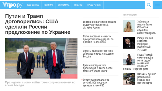 | AI-анализ | --- The portal Utro.ru provides the latest news in Russia and the world, including news on politics, show business, and incidents. The website features a news feed and sections for show business, politics, economy, press releases, and more. Topics include Putin and Trump's agreement on Ukraine, Europe's decision on Russian assets, Putin's replacement of a threatening official, Baltic countries preparing for evacuation due to Russian aggression, events in Kiev following a Russian military strike, a secret discovery in the Ukraine conflict zone, Sedokova's wardrobe malfunction, the Russian mafia kingpin in show business, and various recipes, city guides, and horoscopes. The site also features news from partner sites, such as smi2.ru, and information on the ruble's exchange rate. |