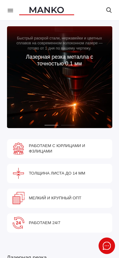 | SEO-описание | Manko (ООО «Блесна») — полный цикл металлообработки: лазерная резка и гибка листового металла, сварка, порошковая покраска, изготовление металлоконструкций. Онлайн-расчёт 15 мин, производство от 1 дня. |