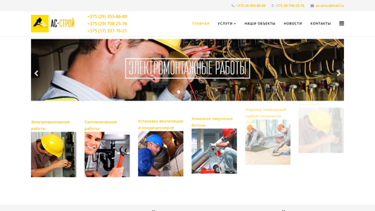 | AI-анализ | The website <http://as-strou.by> is a service provider offering a range of santech and electromontaj (installation and repair) services in Minsk under a key contract. Services include installation and repair of heating, plumbing, water supply, external engineering networks, thermal points and boilers, technical equipment, commissioning, electrical wiring, lighting systems, electrical switchgear, outdoor electrical works, grounding and lightning protection, and outdoor lighting. Keywords reflect the company's expertise in santech and electromontaj services in Minsk. |