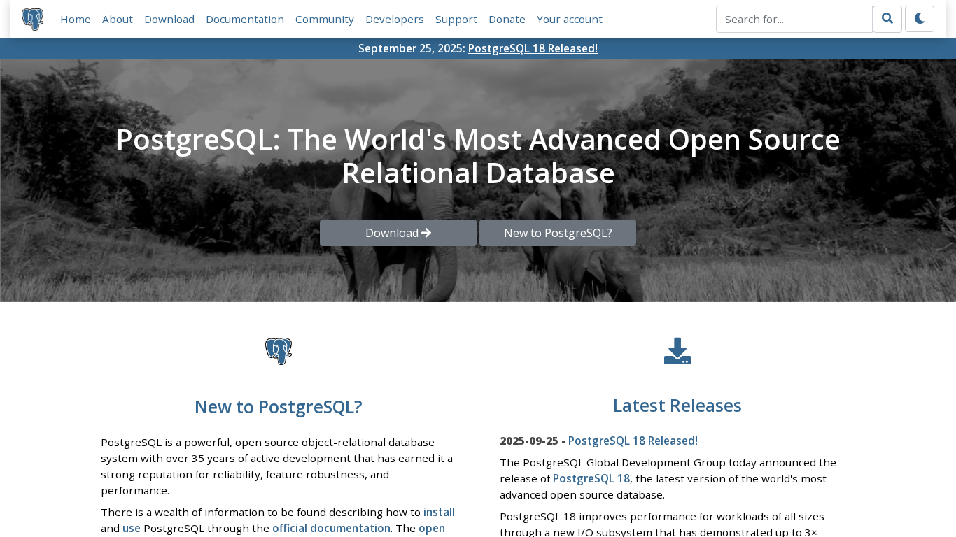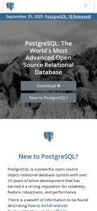 | AI-анализ | This is the official website for PostgreSQL, the world's most advanced open source relational database. The site provides comprehensive information about the database system, including documentation for installation, use, and development. Visitors can download the latest version of PostgreSQL, learn about its features and performance improvements, and engage with the global community of developers and users. The site also includes resources for new users, a feature matrix, information on governance and latest releases. The latest version, PostgreSQL 18, was released on September 25, 2025, and offers improved performance, major-version upgrades, virtual generated columns, and support for OAuth 2.0 authentication. |