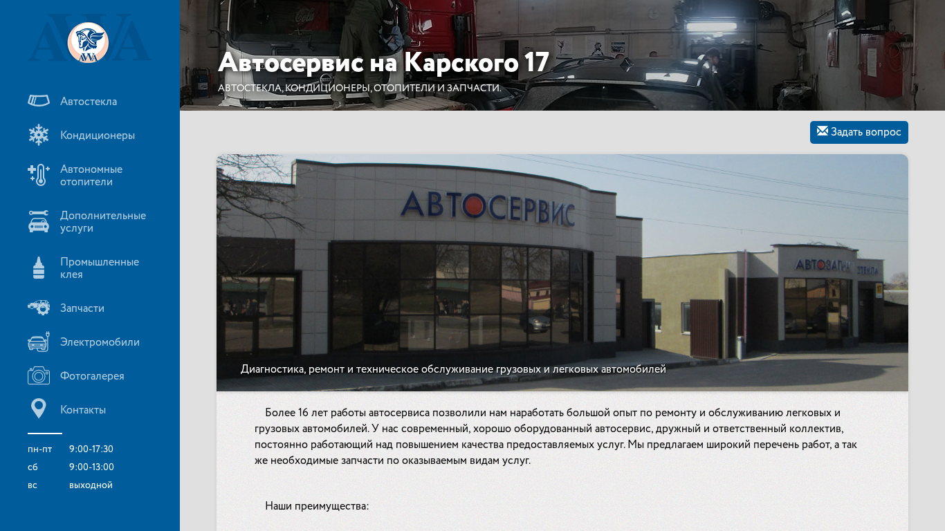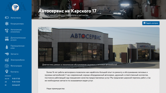 | AI-анализ | The website is an auto service located in Grodno, Belarus, at the address Карского 17. The website offers automobile technical services, including glass replacement and repair, air conditioner installation and refilling, heater repair, and computer diagnostics. The company has over 16 years of experience and boasts a modern, well-equipped service center staffed with a friendly and responsible team dedicated to improving the quality of their services. They provide a wide range of services and necessary parts for the types of vehicles they serve. The website features a gallery of photos, contacts, and operating hours Monday to Friday from 9:00 to 17:30, and Saturdays from 9:00 to 13:00, with Sundays being a day off. The company claims to have the largest experience in installing windshields and servicing air conditioners and heat |