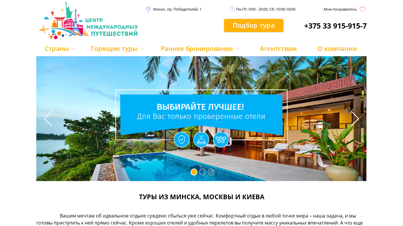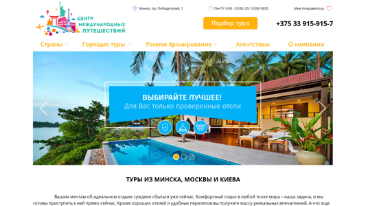 | AI-анализ | The portal is an online tour and travel agency offering tours and vacation packages from Minsk, Belarus, for various destinations worldwide including Vietnam, Greece, Egypt, Spain, Cyprus, OAE, Thailand, Tunisia, Turkey, Bulgaria, and Vietnam. Users can search for tours, prices, and make bookings online. The agency also provides information on hotels and offers early booking discounts. Office hours are from 9:00-20:00 Monday to Friday, and 10:00-18:00 on Saturdays. Contact number is +375 33 915-915-7. The company organizes vacations to suit customers' preferences and offers partnership opportunities and customer reviews. Tours are available from Minsk, Moscow, and Kyiv. The website includes information on various types of vacations such as family vac |