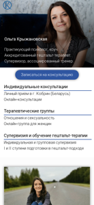 | AI-анализ | The portal kryzhanovskaya.by is a website dedicated to Olga Kryzhannovskaya, a practicing psychologist and coach. Accredited as a gestalt therapist, she also acts as a supervisor and associate trainer. Individuals can schedule consultations with her in person in the city of Kobrin, Belarus, or online. She offers individual and group consultations, therapeutic groups focusing on relationships and sexuality, and supervision and training in gestalt therapy. Her approach is described as joyful, spontaneous, and thoughtful. She values people's desire to change their lives for the better. Professionally, she has over 15 years of experience and has worked with adults and adolescents. She holds degrees from Brest State University and the Moscow Gestalt Institute, specializing in psychology and gestalt therapy, respectively. Her certifications were issued by |