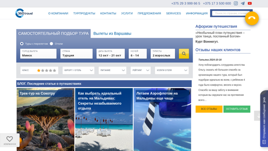 | AI-анализ | The website 360Travel is a travel agency and tour operator based in Minsk, Belarus. It offers various tour packages, including flights and cruises, and helps customers find accommodations in good hotels at affordable prices. The company has a rich experience in personal travel experiences and provides individual tours, early bookings, and an online service for tour selection from Minsk. The website is known for its high rating among tour companies and tour operators. The top destinations for the company are the United Arab Emirates (UAE) and the Maldives. The website provides information about the company's mission and values, payment methods, customer reviews, and services such as transfers, insurance, and visa support. The website also offers business and MICE tourism, as well as discounted tours and health resorts in Belarus. Users can make online bookings for various tours and receive a guarantee |
