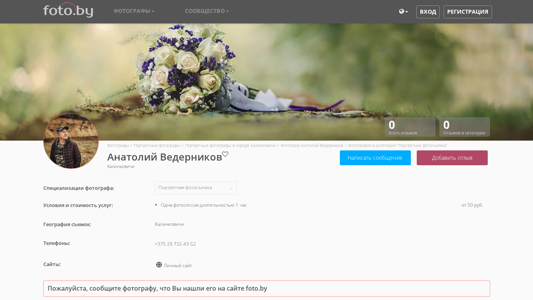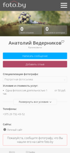 | AI-анализ | The web project is a photography website for Anatoly Vedernikov, a photographer based in Kalinkovichi, Belarus. The site features a portfolio of portraits in the "Portrait Photography" category. Anatoly identifies himself as a children's photographer, portrait photographer, and aerial photographer in the city. The site provides no information on pricing or contact details. |