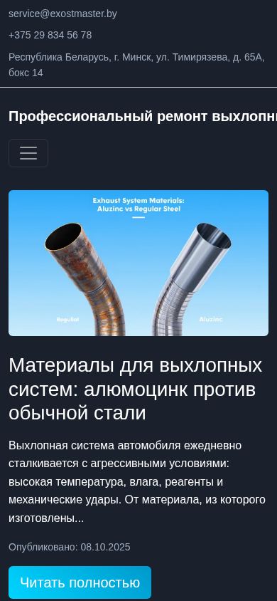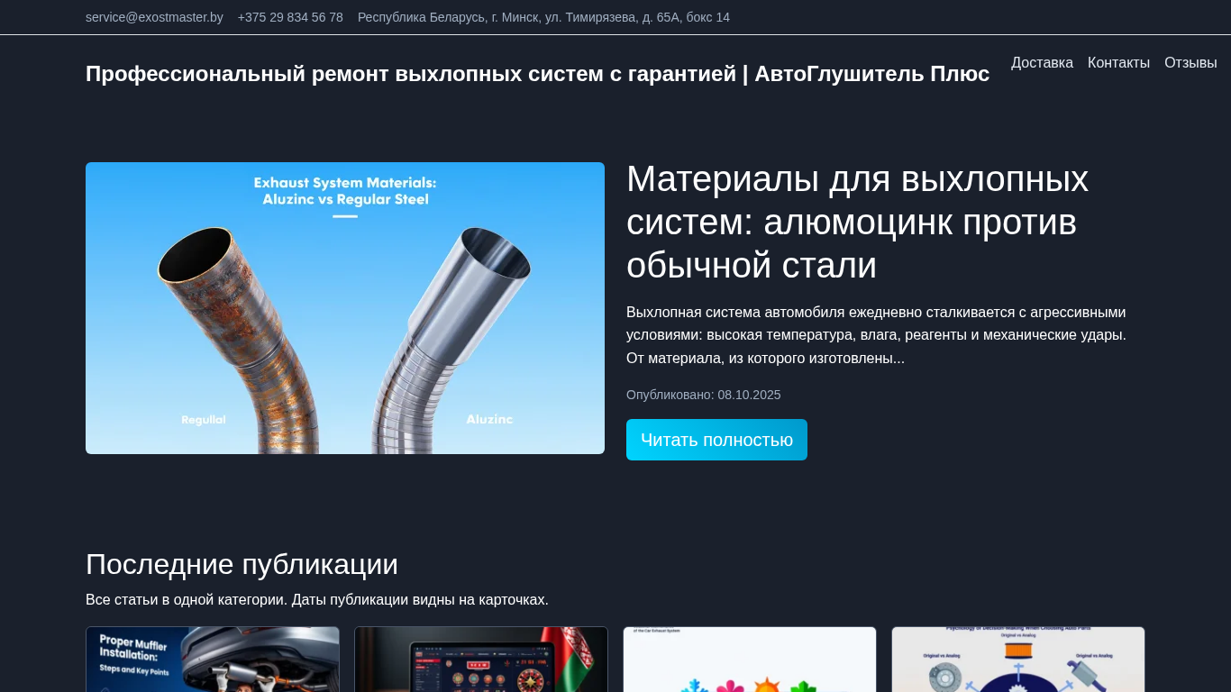 | SEO-описание | АвтоГлушитель Плюс — профессиональный ремонт и обслуживание выхлопных систем автомобилей в Беларуси. Гарантия на все виды работ. Установка глушителей, шумоизоляция, диагностика. |