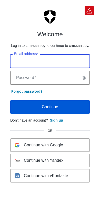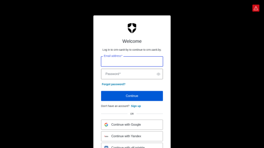 | AI-анализ | The portal crm.sanit.by is a website for logging into a CRM system. Users are required to enter their email address and password to access the system. The website also offers the option to continue with Google, Yandex or vKontakte accounts. Passwords can be shown or hidden. Users are warned if they are currently using development keys, which should not be used in production. The website is accessible via the domain crmsanit.by. |