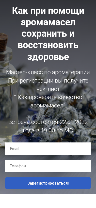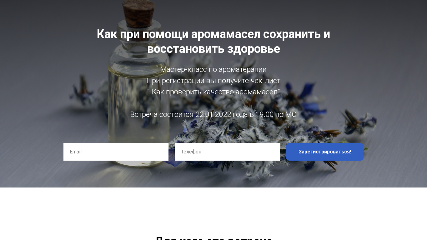 | AI-анализ | The portal "Confidenz.tilda.ws" is a business website dedicated to the promotion and sale of aromamassels for health protection and restoration for the entire family. The site offers a masterclass in aromatherapy, registration for which grants access to a checklist, and information on the quality assessment of aromamassels. The event is scheduled for January 22, 2022, at 19:00 MSK and is led by Irina Mikhailovna Lugova, a phytotherapist, multiple speaker at Russian phytotherapy conferences, pediatrician, therapist with a 15-year career, aromatherapist, and diagnostician. The methods of aromadiagnostics developed by Irina Lugova are presented at the event. Participants will learn about one aromamassel as an alternative to chemical medicinal remedies |