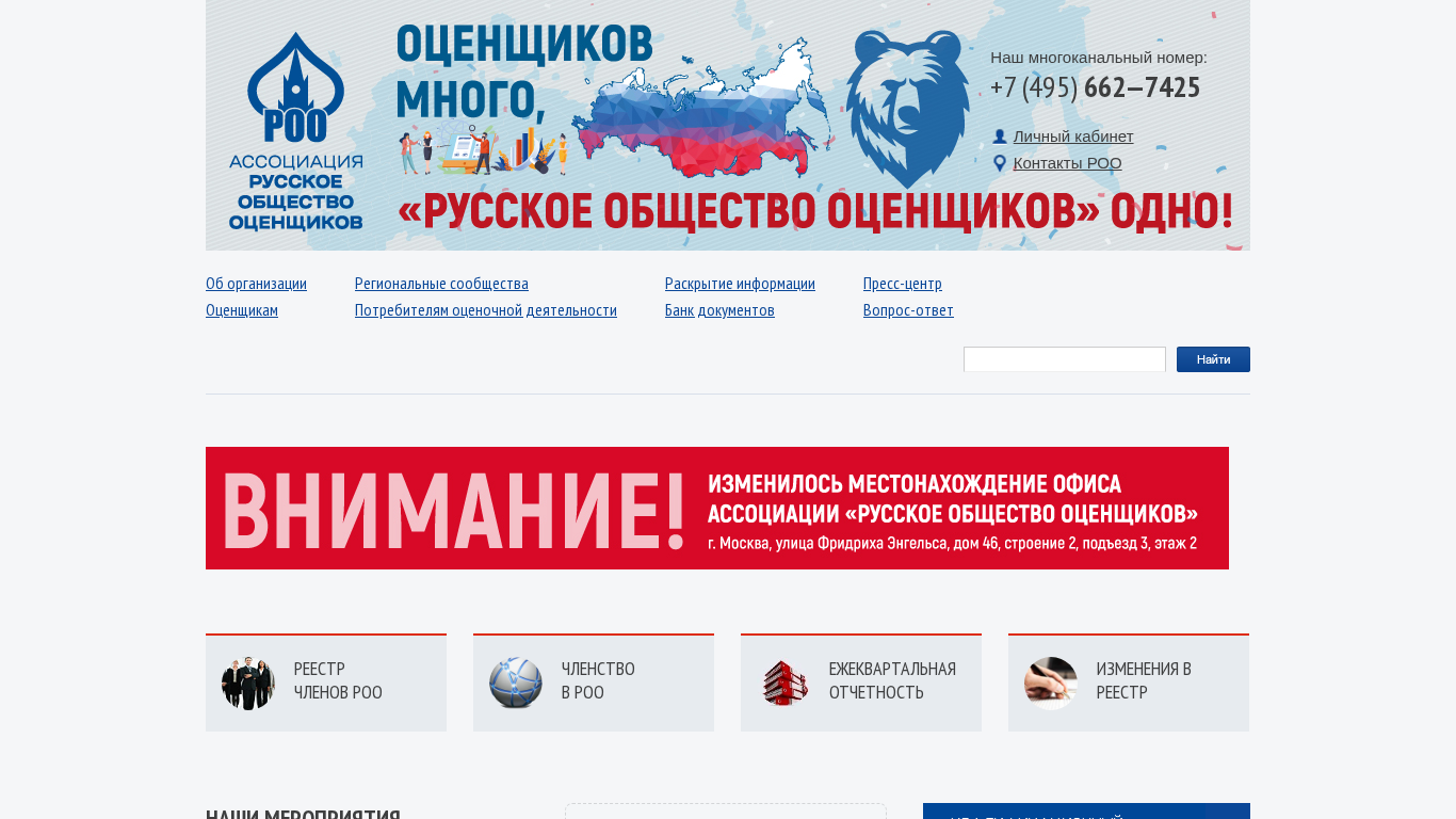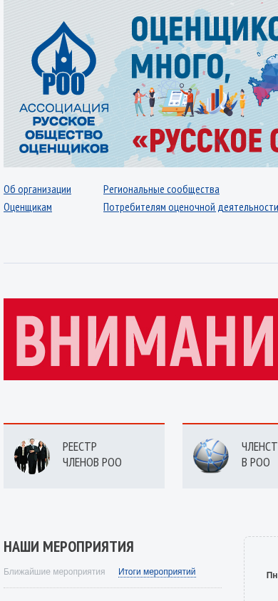 | AI-анализ | This online resource, titled РОО (Russian: Российское Общество Оценщиков, or Russian Society of Appraisers), is a multichannel platform for Regional Communities of Consumers in the field of appraisal activity. It provides access to various events such as conferences, congresses, seminars, and round tables, with a focus on current issues in appraisal practices in Russia and other regions. The website features a press center, FAQ section, a registry of members, and information on membership and quarterly reporting. It also offers a bank of documents and a question-and-answer section. The website's calendar lists upcoming and past events, including a round table on "Current Issues in Appraisal Activity in the Russian Federation" in Tver and a seminar on "Secrets of Mastery: Practical Experience in Expert Evaluation" in the Republic |