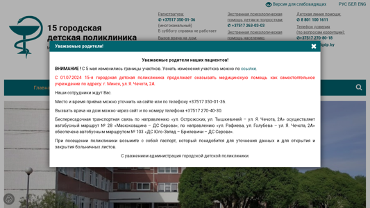 | AI-анализ | The portal 15-я городская детская поликлиника is a healthcare website dedicated to a children's clinic located in Minsk, Belarus. The address is on Yan Chechot Street, 2A. The clinic provides various services including registration, doctor consultation, emergency psychological assistance for children and adults, and a hotline. The contact numbers for different services are listed, such as the multichannel registration number, a home doctor consultation number, and emergency psychological assistance numbers. The clinic operates Monday through Saturday, with extended hours on Saturdays. There is also a section for news, articles, and information on various health-related topics. The website includes a chatbot from the Ministry of Health and information on changes to the national vaccination calendar from 2025. The site offers forms for patients to fill out and an ideological work section. Some services appear to be fee-based |