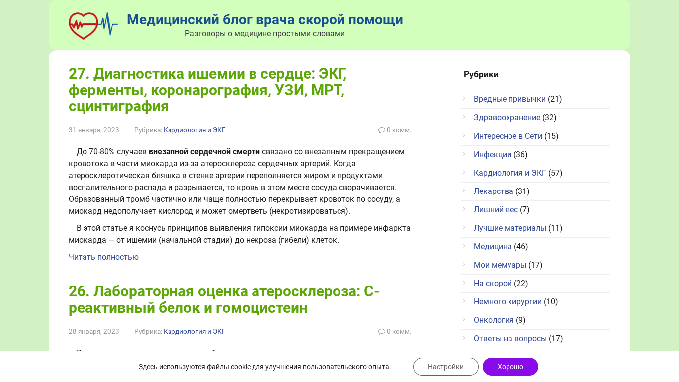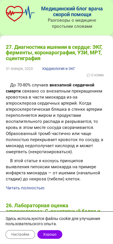 | AI-анализ | This online resource is a medical blog written by a paramedic discussing various medical topics in simple terms. Topics range from cardiology and ECGs to diagnosing ischemia in the heart and assessing the risk of atherosclerosis through laboratory tests. The blog also covers the use of different diagnostic tools, such as C-reactive protein and homocysteine tests, to evaluate the risk of cardiovascular events and sudden cardiac death. The blog is organized into various categories, with each post providing a complete reading. The title of the blog is "Медицинский блог врача скорой помощи — Разговоры о медицине простыми словами" (Medical Blog of a Paramedic — Conversations about Medicine in Simple Words). |
