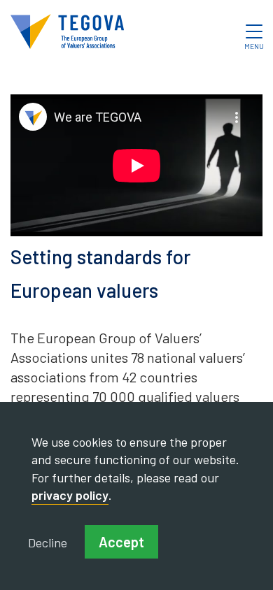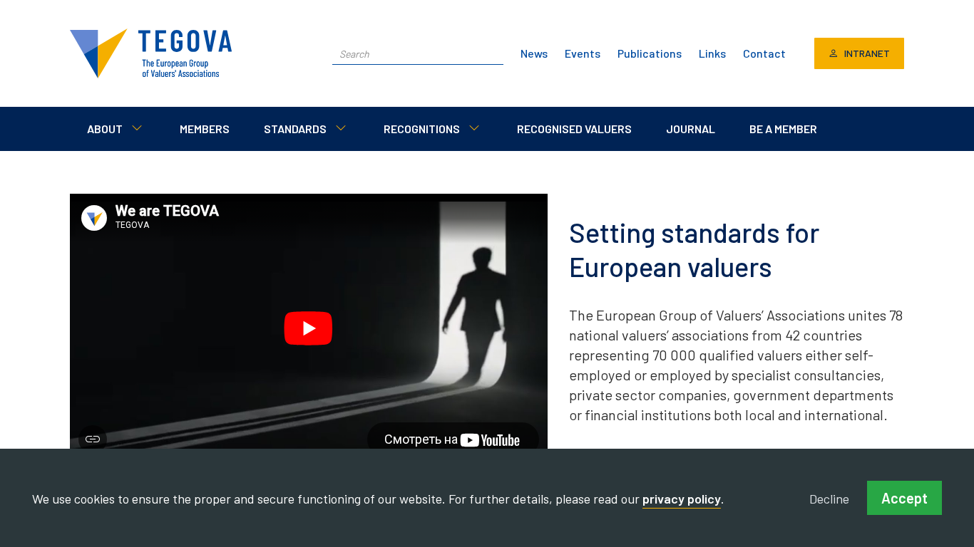 This online resource, TEGOVA (<https://www.tegova.org/>), is the European Group of Valuers' Associations' website. It provides information about the organization, its boards, committees, and the European valuation standards it sets. The site includes sections for the European Valuation Standards Board (EVSB), European Business Valuation Standards Board (EVS-BV), and European Plant, Machinery & Equipment Valuation Standards Board (EVS-PME). It also offers details on minimum educational requirements, profiles, and a code of conduct for European valuers. The site includes translations of the standards and recognition of European valuers in various categories. Visitors can access a journal, become members, and search for news, events, publications, and links. The organization represents 78 national valuers' associations from 42 countries.