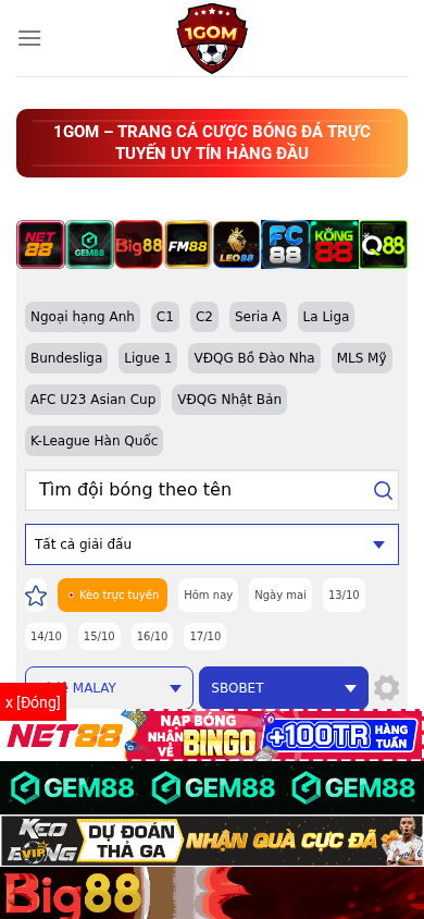 | AI-анализ | This website is a professional betting platform with attractive odds titled "1GOM – Nơi hội tụ cược thủ chuyên nghiệp với tỷ lệ kèo hấp dẫn". It offers high-quality soccer betting with transparent odds, fast deposits and withdrawals, and welcome bonuses for new members. The homepage directs users to the soccer ranking table, soccer results, and soccer news on 1GOM – A top-rated online soccer betting site. Featured soccer leagues include the English Premier League, German Bundesliga, French Ligue 1, and Vietnamese VĐQG, among others. Users can select from various odds and leagues for betting, including real-time odds and various audio options. The website also provides data for other betting options. |