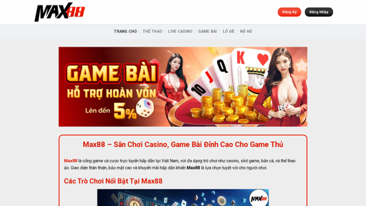| SEO-описание | Max88 mang đến trải nghiệm casino trực tuyến và game bài đổi thưởng đỉnh cao, tốc độ mượt mà, khuyến mãi khủng cho người chơi mới. |