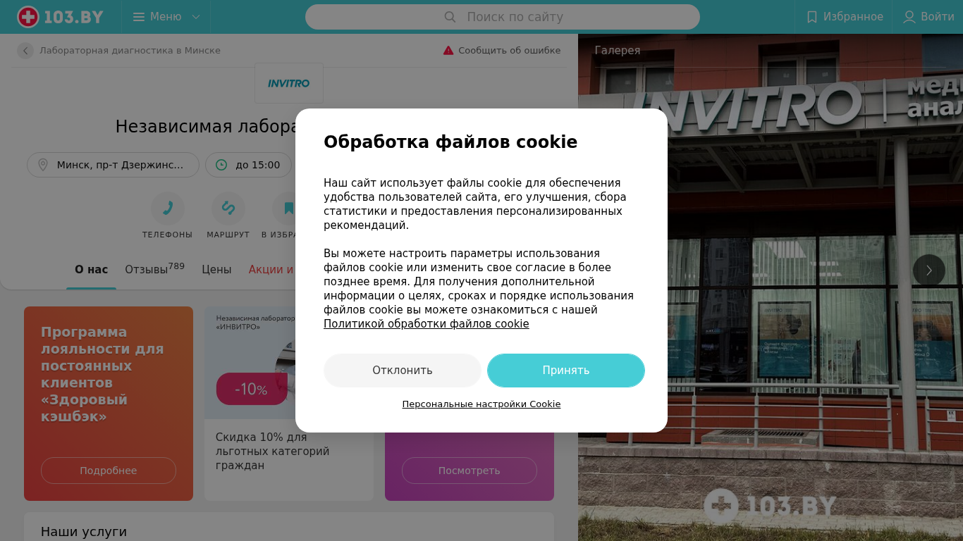 | SEO-описание | Независимая лаборатория ИНВИТРО Минск пр-т Дзержинского 26-395 – телефоны, время работы, отзывы и схема проезда в каталоге медицинского портала 103.by. |