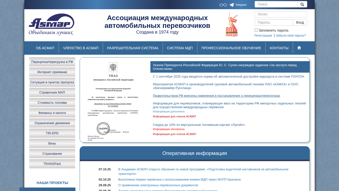 | AI-анализ | The website is for the International Automobile Carriers Association (ASMAP), established in 1974. It provides information for its members and international haulage truck importers planning to enter Russia. The site includes news on events, updates on regulations, and operational information. Members can access a discount on virtual fuel cards from Lukoil. The site also features an academy for professional training. There are announcements about the latest program for training driver-instructors and the first transport with the use of the MDP book through MAPP. Information is provided on the application of electronic transport documents, the registration process for Latvia's electronic queue system, and the resumption of traffic between Poland and Belarus. The site also includes news on changes in insurance requirements in Azerbaijan, the launch of the electronic queue at MAPP Verkhniy Lars, and the International Digital Transport Forum 2 |