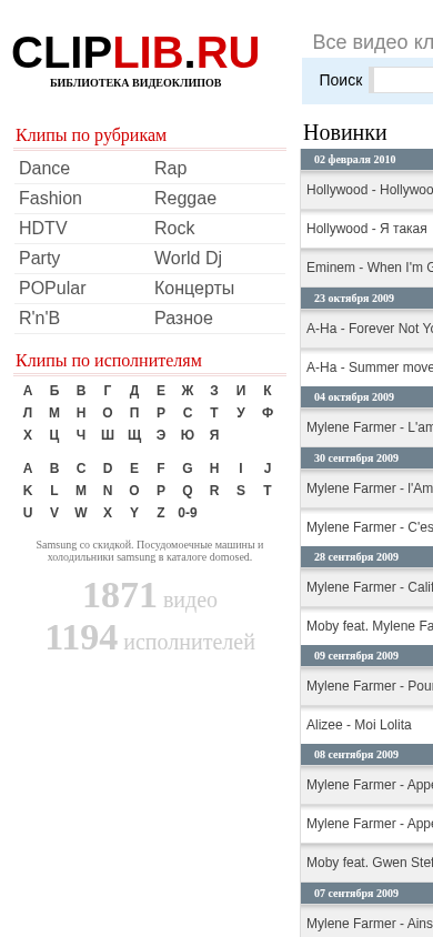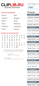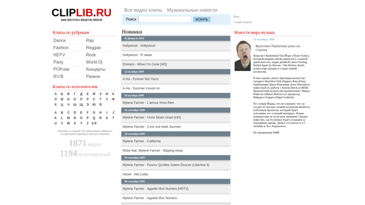 | AI-анализ | The web project "CLIPLIB библиотека видеоклипов" is a Russian video clip library, providing access to various music videos and news. Users can search for clips by categories such as Dance, Fashion, HDTV, Party, Popular, R'n'B, Rap, Reggae, Rock, World, DJ, Concerts, and Random, and by artists. The library contains 1871 videos and 1194 artists as of February 2010. Users can create an account and log in to access features such as email and password protection. Video resolutions range from 720x576 to 1280x704, and formats include mpeg2 and mpeg4. Some examples of available videos include "Hollywood - Я такая" with a resolution of 720x57 |