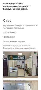 | AI-анализ | The web project "Baraholka24.by" is a platform for buying and selling retro, old, and collectible items in Belarus. The description explicitly states 'Быстро, дорого' (quick and cheap), indicating the focus on efficient transactions. The keywords and top_words also confirm the purpose of the site, with frequent occurrences of 'скупка' (purchase), 'ретро' (retro), 'старых' (old), 'коллекционных' (collectible), 'предметов' (items), 'беларуси' (Belarus), and related terms. The contact information includes phone numbers for calls and various messaging apps. The location is provided as being in Minsk on Sukharevskaya Street, with the address and pavilion number given. The domain name is "Baraholka24 |