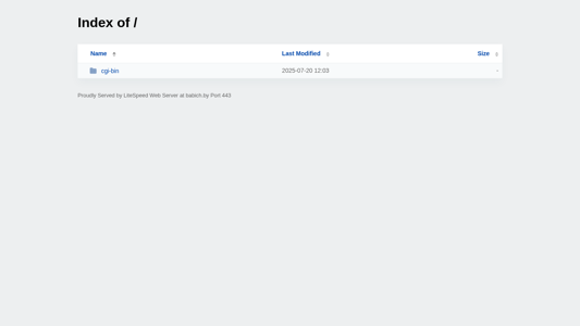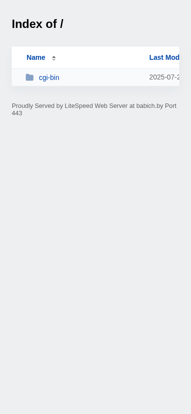 | AI-анализ | This online resource, babich.by, is a common web server index page. It provides a list of files and directories within the server's document root, including their names, last modification dates, and sizes. The page is generated by the LiteSpeed Web Server software and is accessible via port 443 using a secure connection. The title of the page is simply "Index of /" and it contains the keywords "index," "name," "last," "modified," "size," "cgi-bin," and "proudly served." The file "cgi-bin" is identified as a CGI script directory, last modified on July 20, 2025 at 12:03. |
